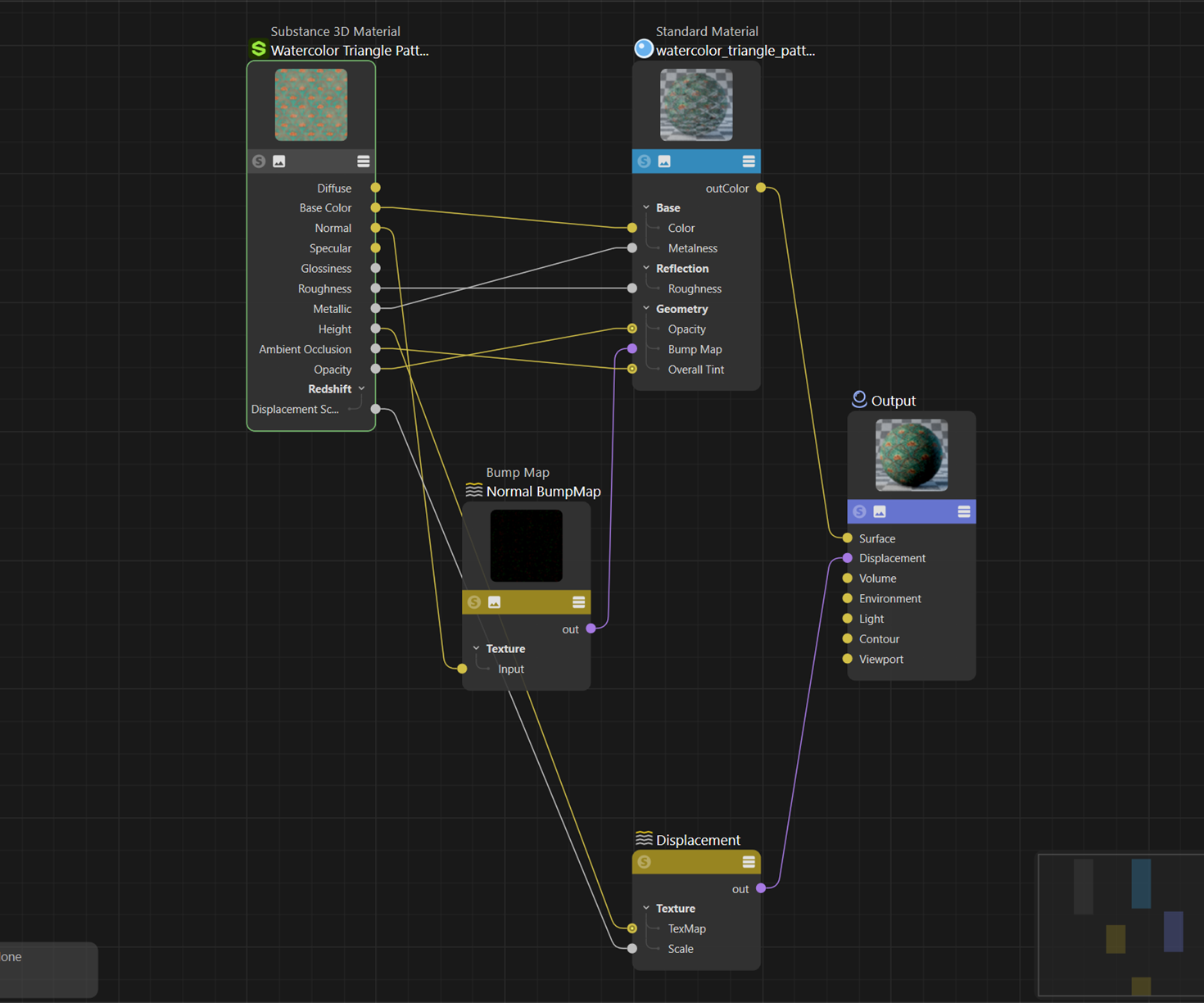 The Substance node tree has five nodes, created automatically for you on loading the Substance file, compared to Instamat's nine; also, all the Instamat bitmaps have to be loaded manually into the five texture nodes. But that's not the only advantage Substance has. If you select the Substance 3D Material node, the attributes look like this: