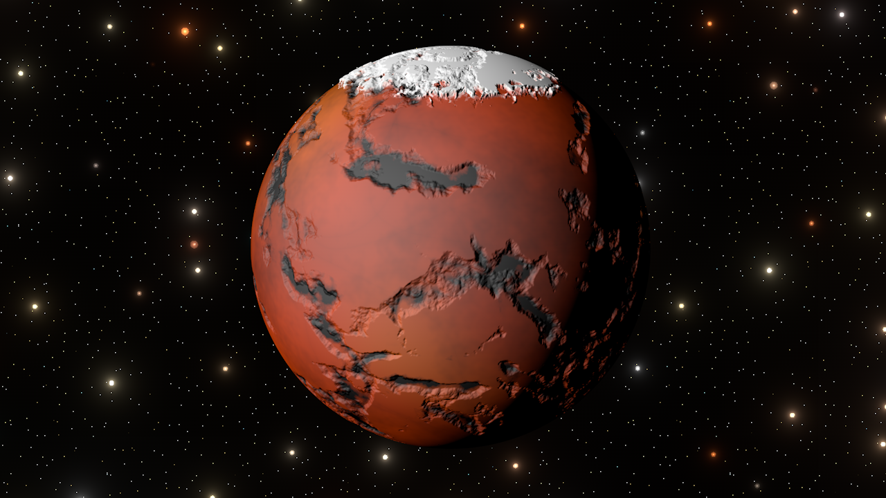 This shader is part of the 'Space' series of plugins from this site and simulates a red planet similar to the appearance of Mars. Below are some example renders showing what the shaders do. Click the small image to see a larger version. (The star field background is generated using the StarScape shader available on this site.)