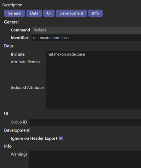This adds the basic object properties. For nodes we do the same, in this case by adding a description called net.maxon.code.base