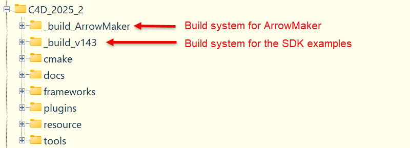 This is then saved as 'custom_paths.txt'. Where to save it? The SDK docs imply that it goes into the root directory for the build - in my case, that would be the folder '/C4D Plugins/C4D_2025_2'. But if I do that, then when I add another plugin to build, I'll have to edit that file and if I then wanted to generate the build system for ArrowMaker again for some reason, I'd have to change it back. Since it can go anywhere, the logical place seemed to me to be the project folder of the ArrowMaker folder, alongside the project definition file. This seems to work fine.