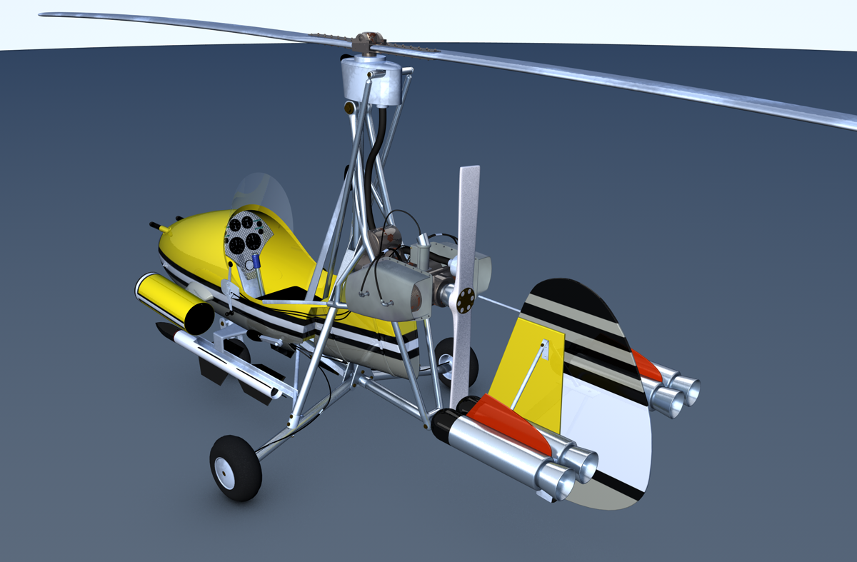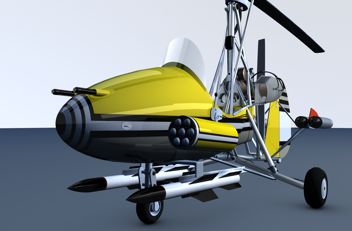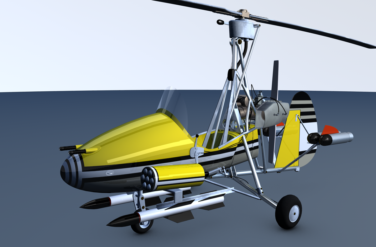 Little Nellie is the Wallis WA-116 Agile autogyro which is a star of the James Bond movie 'You Only Live Twice'. Looking back through some of my old models, I see that I modelled her way back in 2008, but never released it for anyone else to use. I have now made it available for anyone to download and use for free. Here are some images to show what it looks like. Click the small image to see the full-size version:
