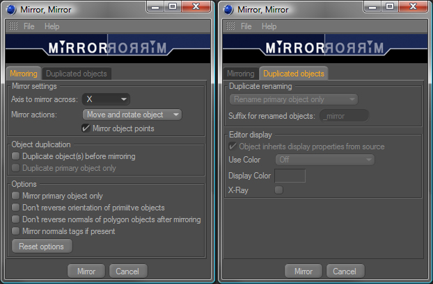 However, you can't always do this easily. Cinema has the Symmetry object and the Mirror tool - but there are disadvantages with both. Mirroring a series of objects manually is always possible but can be time-consuming and sometimes frustrating. Mirror, Mirror is intended as a one-click solution to this problem.