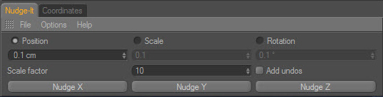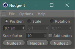 This is the simple dialog box which appears when you call Nudge-It from the plugins menu. The options and controls are explained in the PDF manual included in the archive. It can also be docked in the Cinema GUI, and then takes up no excess screen space: