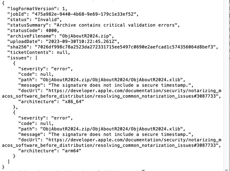Now, the problem here is this. Suppose when signing the plugin in XCode you did everything except (for example) setting 'Enable Hardened Runtime' to 'Yes'. You even included the "--timestamp" switch, so you'd expect the notary service to tell you what you needed to put right. As far as I can see, it doesn't. I've tried several deliberate errors and the only report I've ever received is for a missing timestamp, and even if you then correct the actual error in Xcode so that everything should be fine, you still get the same error response. The only solution then is to make sure everything is correct in the code signing in XCode, then manually sign the plugin as shown in step 7 on the older page. Then it will (should) work.
