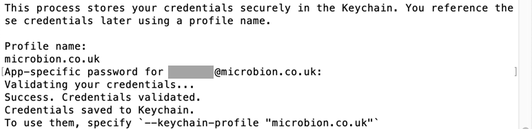 Note that it asks for two pieces of information. The first is a profile name, which can be anything; I chose my website's domain name, which is echoed to the terminal ('microbion.co.uk'). You will certainly want to choose something different. Then it wants the app-specific password you already generated for your Apple ID, and it doesn't echo this. Finally, it attempts to validate these credentials and assuming it does so successfully, it saves them to the keychain. Once that is done, you will never need to do steps 1 and 2 again, because you can just get the credentials for notarizing from the keychain.
