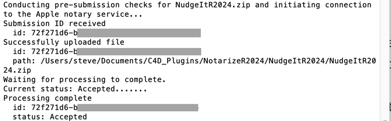 Very importantly, that single line saying 'status: Accepted' is the only indication you get that the plugin has been notarized. Unlike the previous method, the notary service does NOT send an email with the result in it.